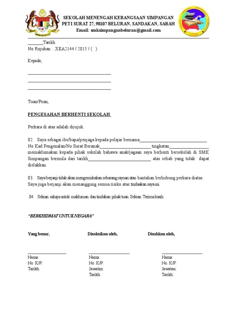 Contoh surat rasmi berhenti sekolah, contoh surat rasmi berhenti kerja, contoh surat rasmi berhenti sekolah, surat berhenti kerja rasmi, . Contoh surat rasmi berhenti menjadi ahli koperasi tentera via suratr.blogspot.com. Contoh surat rasmi tunjuk sebab kesalahan membuat format . Contoh surat rasmi berhenti sekolah agama bantuan, contoh surat rasmi. Download & view surat mohon berhenti sekolah as pdf for free.